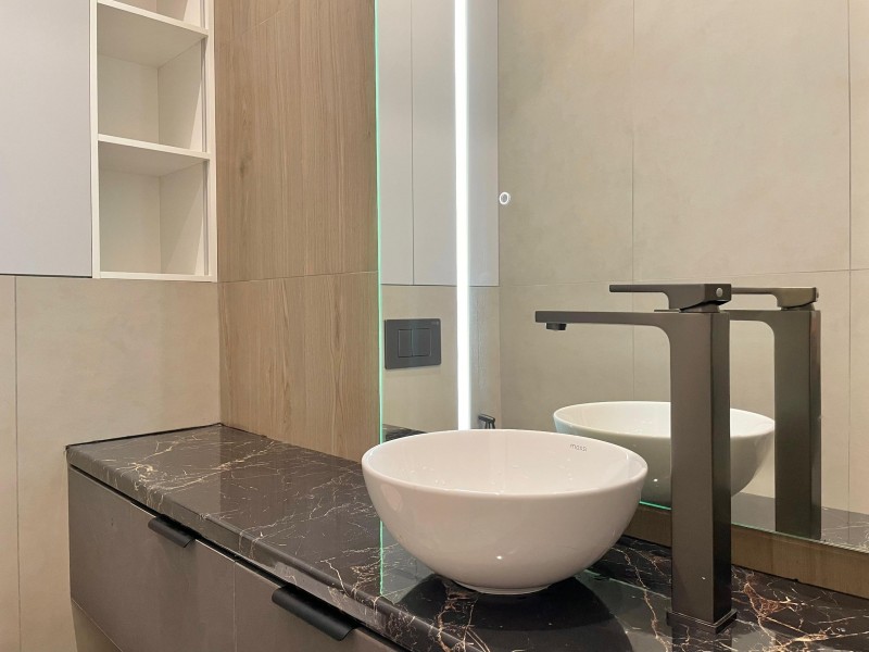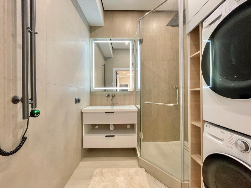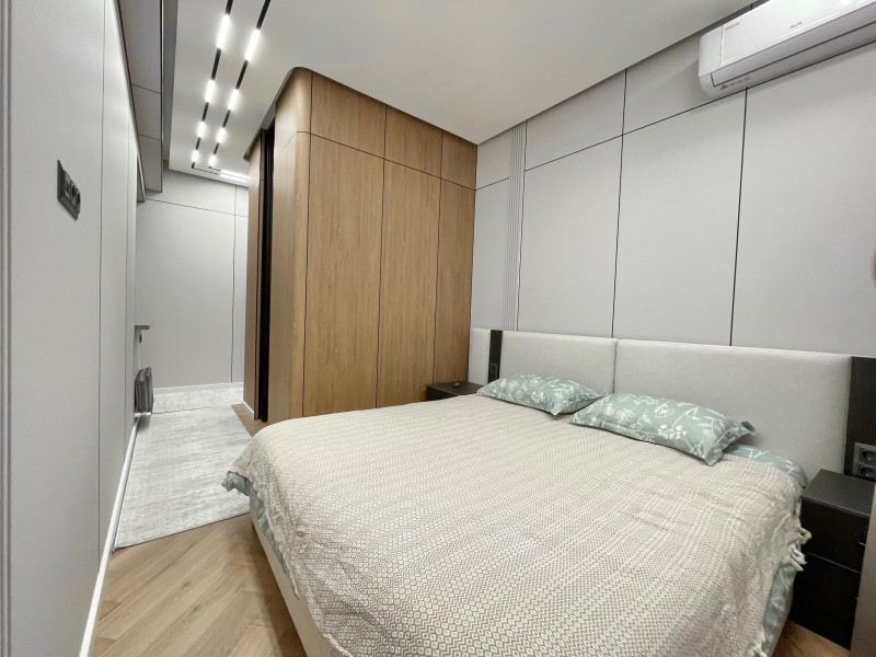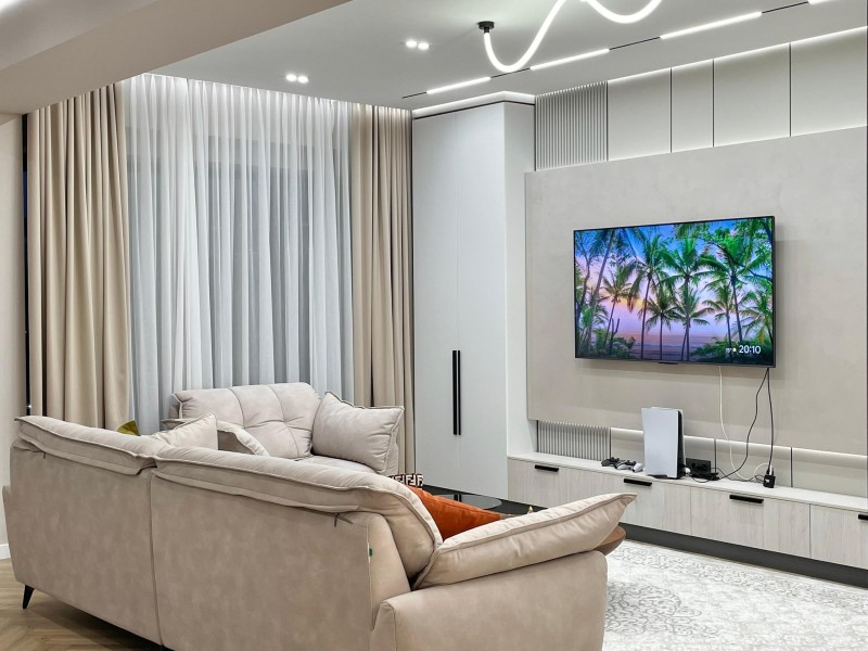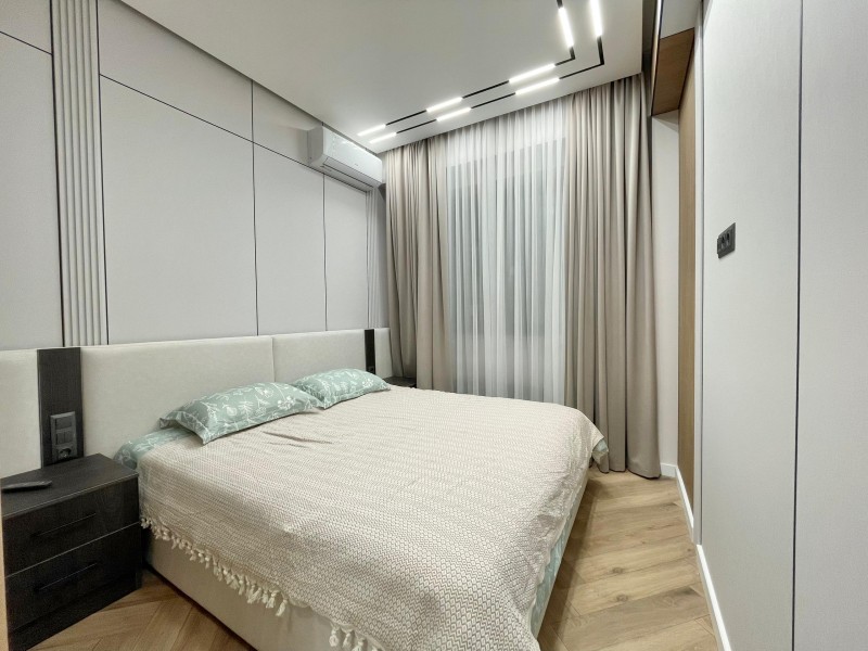 В квартире 1 спальная комната, большая гостиная, кухня и 2 с/у. Полностью обставлена мебелью и техникой. Сдаётся на долгий срок.