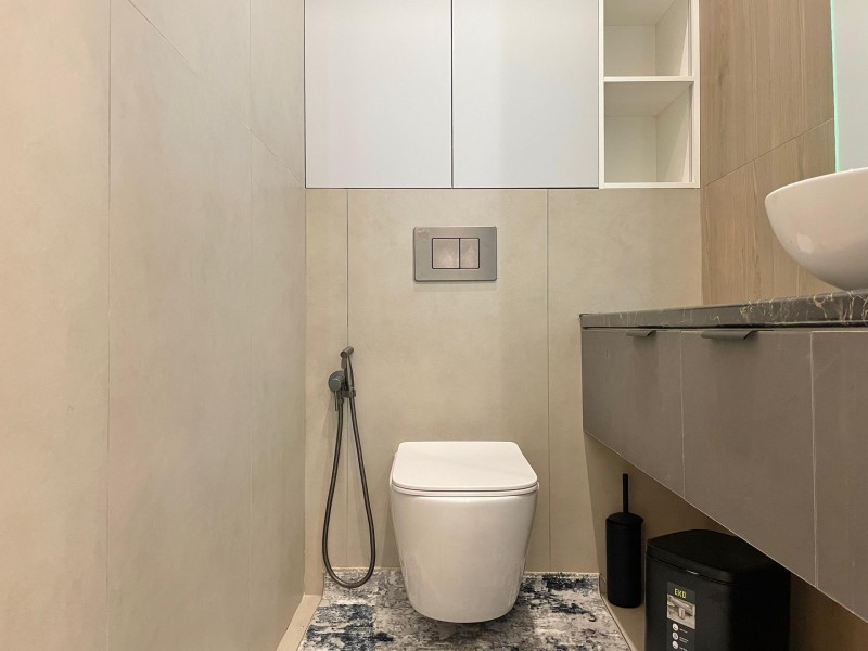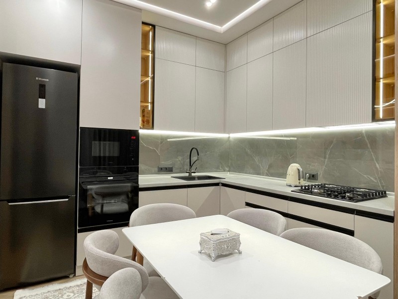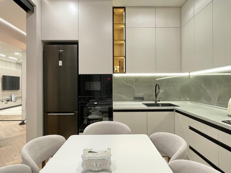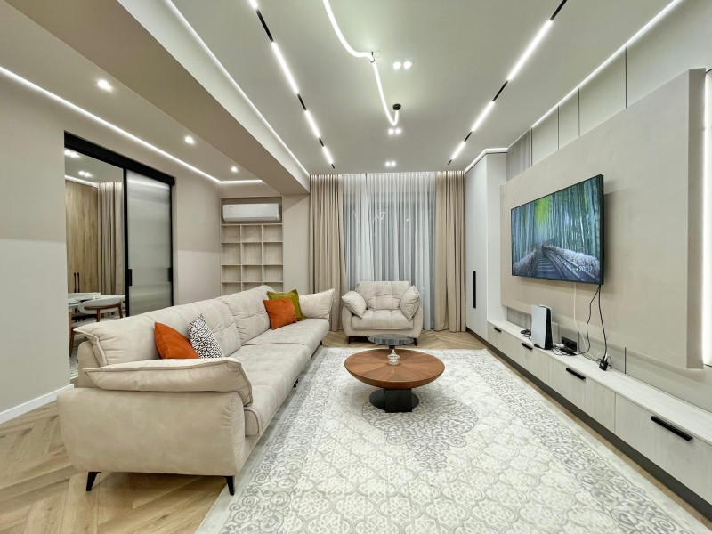 В квартире 1 спальная комната, большая гостиная, кухня и 2 с/у. Полностью обставлена мебелью и техникой. Сдаётся на долгий срок.