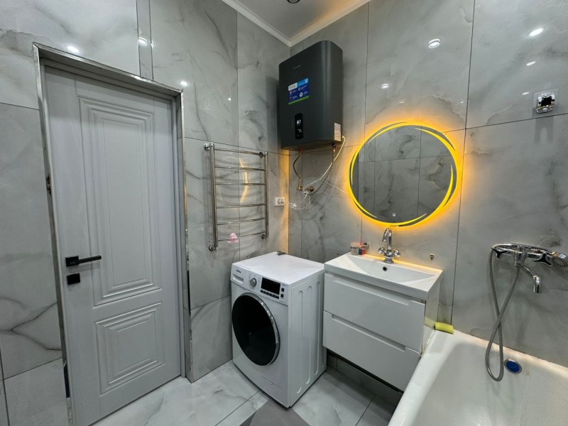 Общая площадь — 70 кв. м, 14 этаж. Квартира полностью меблирована и оснащена всей необходимой бытовой техникой. Сдается на длительный срок.